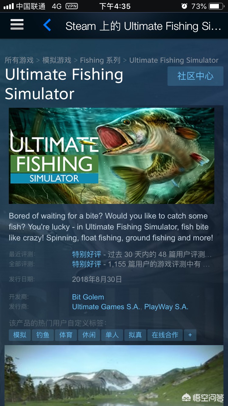 Ultimate Fishing Simulator,中文名:终极模拟钓鱼器,真的不错,做工精致,细节到位,唯一的问题就是网络。steam上68。三大妈有破解不过建议你入正版。