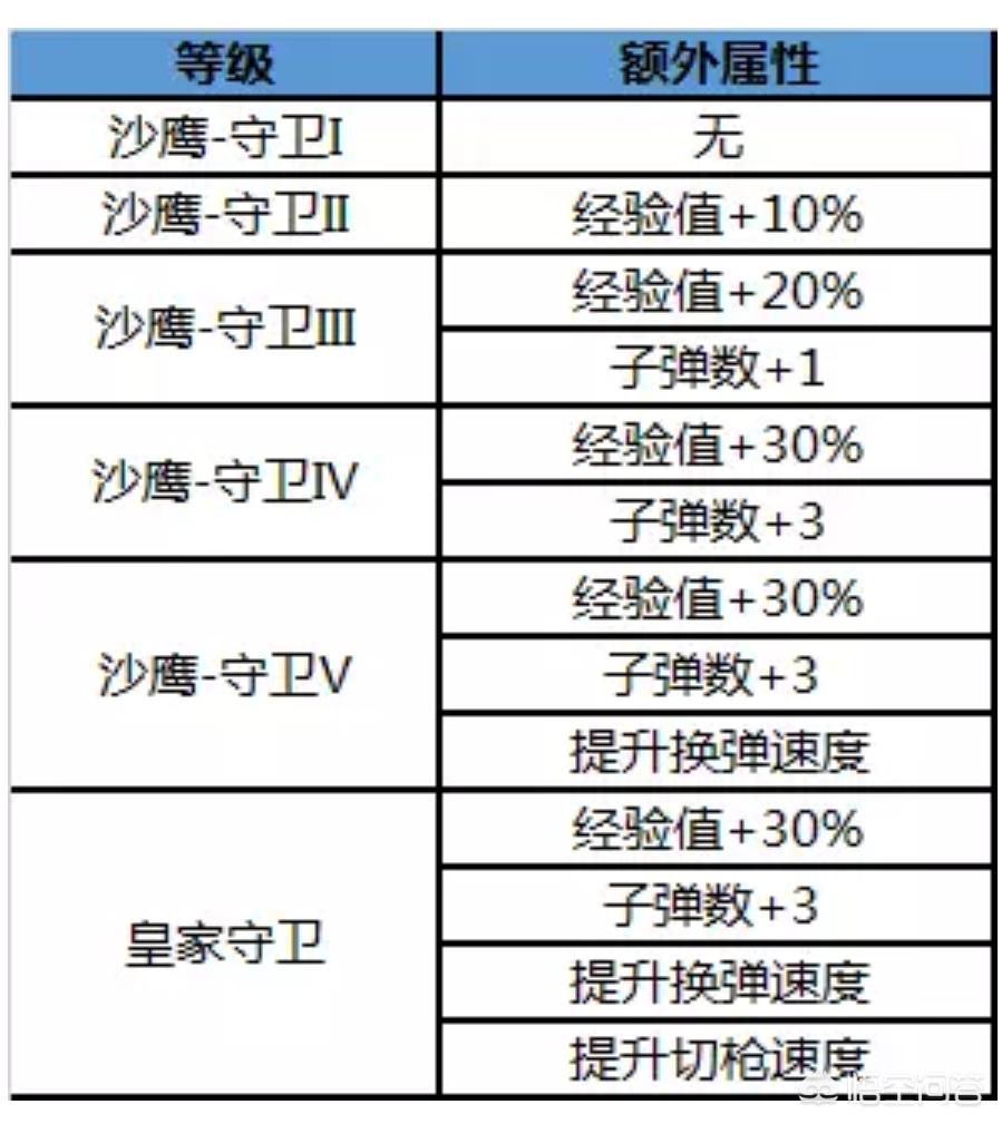 沙鹰—守卫5没有外观,载弹量和经验加成上的改变,但官方介绍:性能得到了提升,比较显著的是“换弹速度”,升级到5整整需要90个材料包。