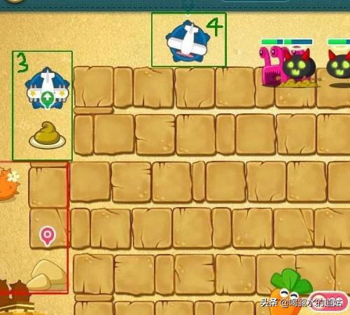 2、清理掉第一个瓶子炮两边的障碍后,会在左边找到第一个隐藏的便便塔,然后在下面再造一个瓶子炮,2个满级瓶子炮加便便塔的组合火力足够应付前面几波小怪。如果不安心,可以在后面放一个瓶子炮来点掉空血的小怪。