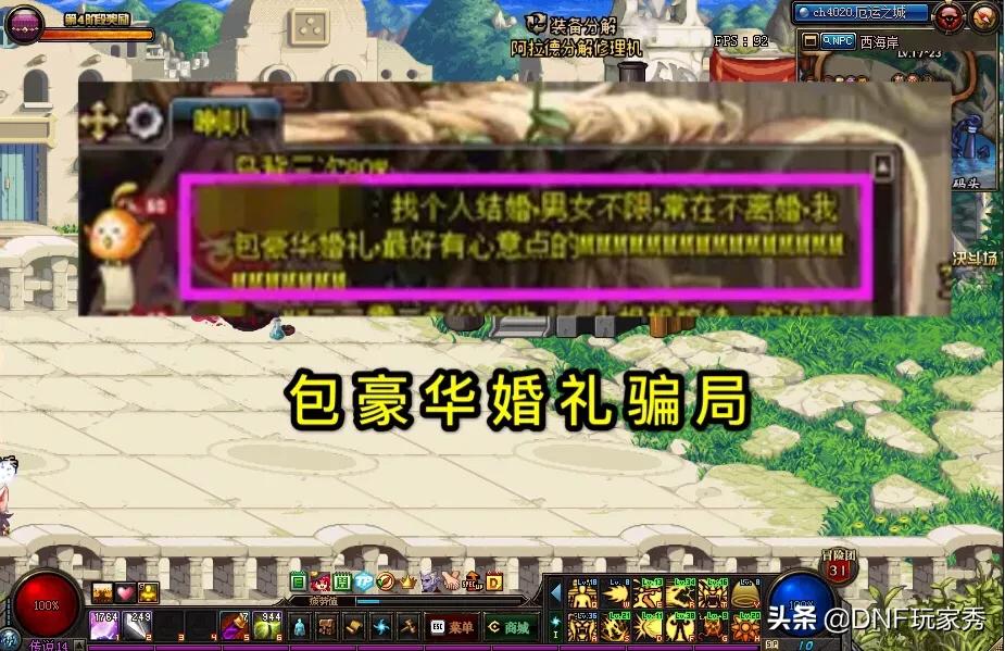 DNF游戏发展11年,要说什么最多,那就是骗子了,从最初的“参军哥无色1金币”,到后来的形形色色的喇叭骗局,拍卖骗局,结婚骗局,各种花样层出不穷!近日,“春节签到活动”送出大量的“心意点”,老掉牙的“150包豪华结婚”的骗局死灰复燃,让部分回归玩家是深陷其中,上了大当。