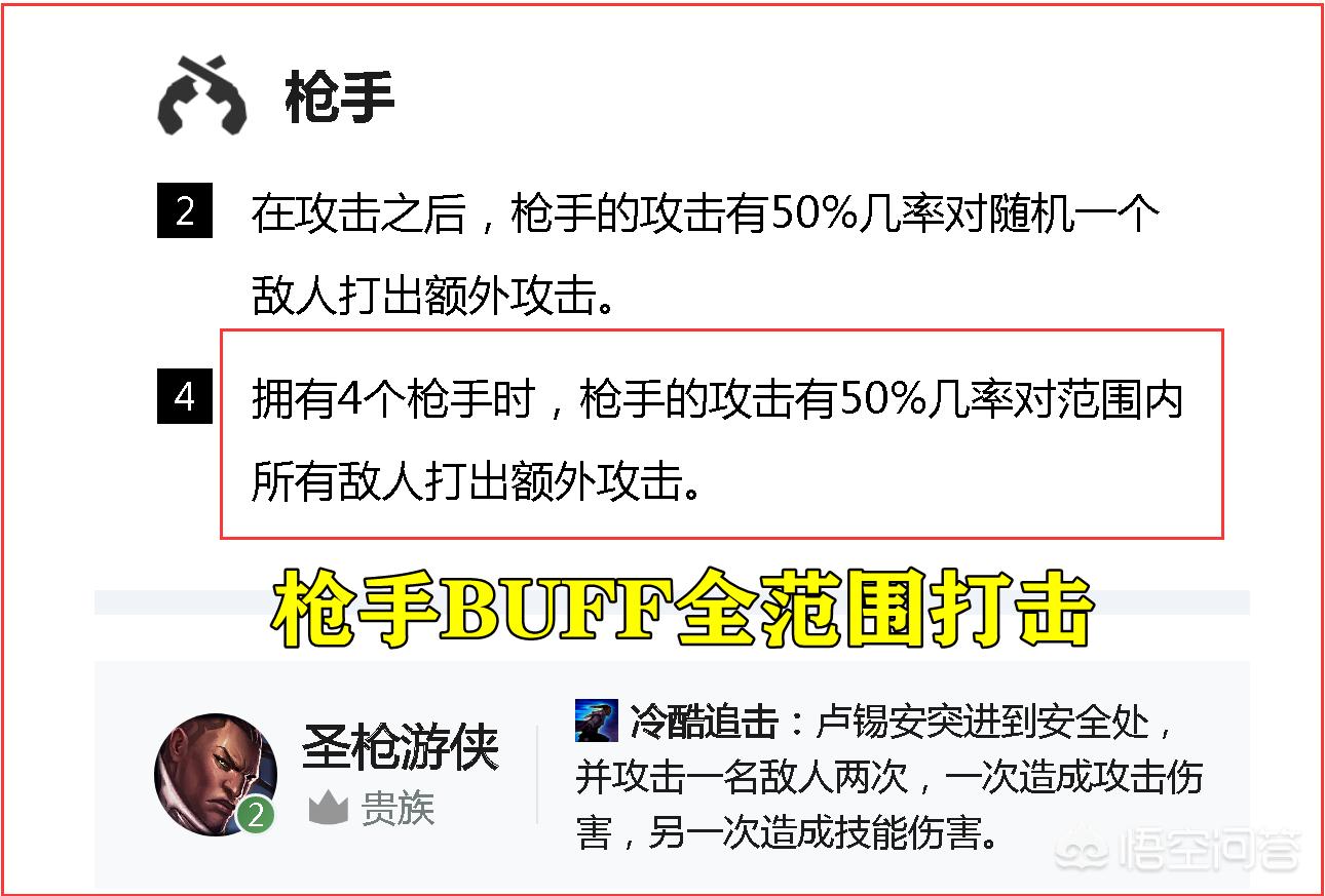 这套阵容就是四枪手九极地,最少需要八人口就可以触发,而且也是在压缩到八人口的时候可以起到最大的效果,多了反而容易拖节奏,下面狗王就简单来解析下这个阵容是思路,首先既然说到了是四枪手九极地,那么这两个元素肯定都是必不可少,首先来看一下四枪手的BUFF,在拥有四个枪手时,枪手对于范围内所有的目标50%几率进行额外打击,这是什么概念呢?当你有四个枪手的时候,可以说每个英雄都是一个群秒机器,类似于装了三四个加强版的飓风,伤害可想而知。