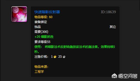 装备可以获得20点暗影抗性,使用后获得的特效是:5秒内将受到的暗影法术反弹给施法者,