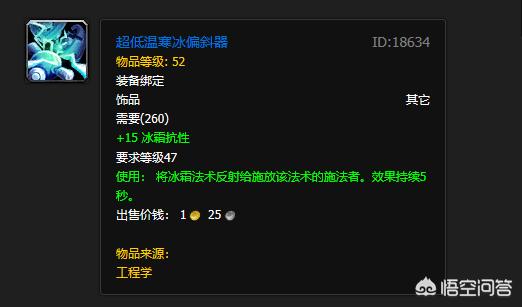 装备可加15点的寒霜抗性,使用后获得的特效为:5秒内将受到的冰霜法术反弹给施法者。