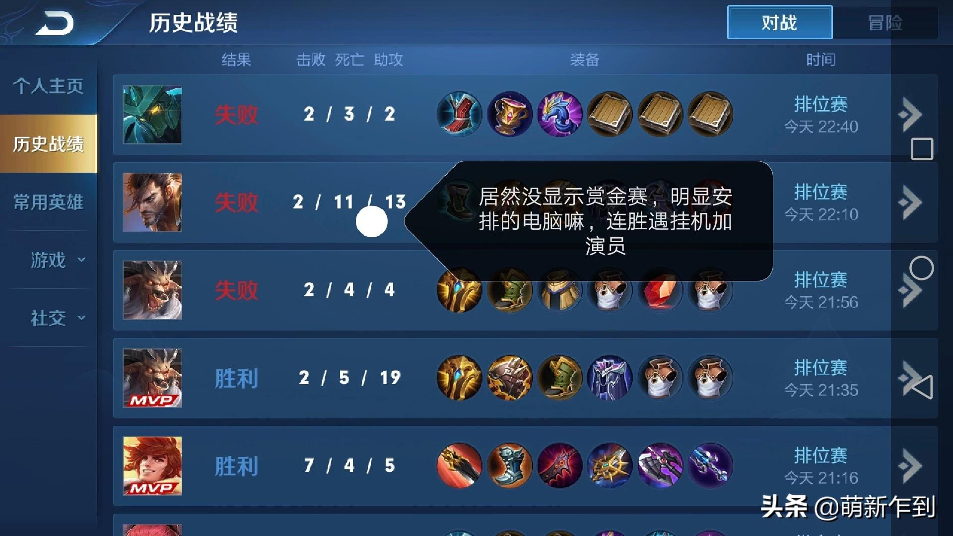 无聊中喷下TX:辣鸡游戏上图为证,竟是演员跟托,还有电脑。胜利几局必有挂机跟演员,这游戏一个人挂机基本上就输了,再碰到恶心演员,心里十万个草泥马在奔腾呀٩(͡๏̯͡๏)۶,一次遇到意外,多次连胜遇到该咋解释??一个演员关羽专踢队友野怪。一个挂机党,点开挂机玩家,居然没显示赏金赛这一局明显电脑嘛。玩游戏,居然被策划玩,这机制安排的就让人上火了,卸了,玩平安京去。