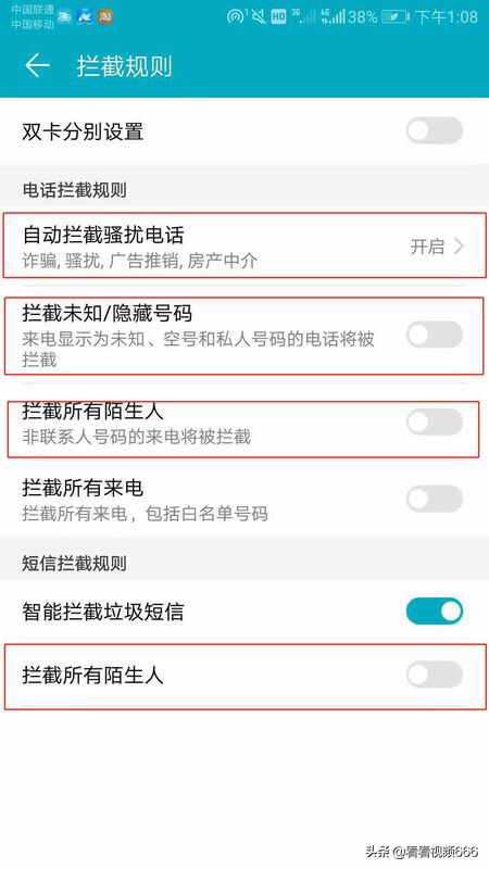 5、在拦截规则这里,开启自动拦截骚扰电话功能,甚至可以开启拦截未知号码、隐藏号码和所以陌生号码的功能。
