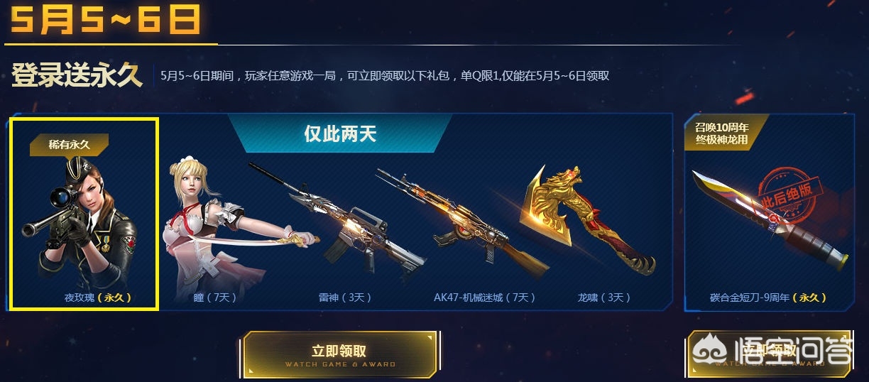 除此之外还有英雄武器四件套,和一把九周年专属武器—碳合金短刀,都是在活动两天内领取,错过活动时间过后说不定以后这个角色就不会在出现了。