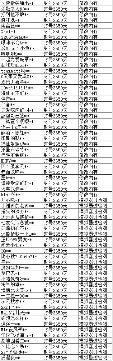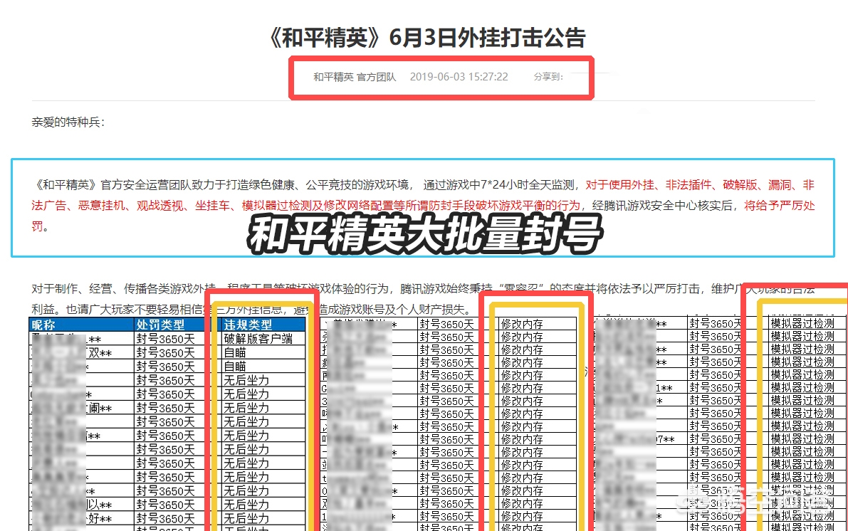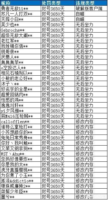 所以在6月3号和平精英对作弊玩家进行了大批量的封号处理,其中作弊类型涉及到了:破解版客户端、自瞄、无后座、修改内存,然后处罚类型为3650天,也就十年封禁时间相当永久了!