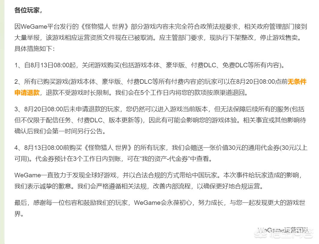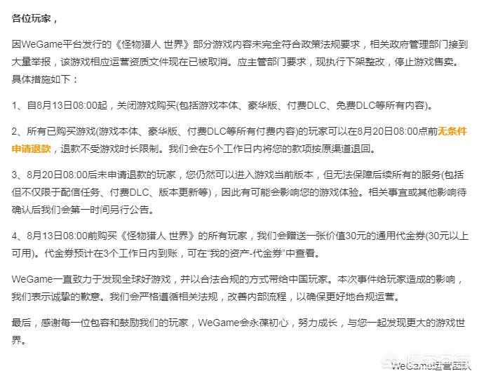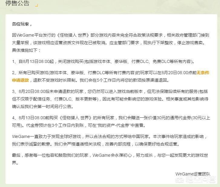 如何看待8月13日wegame平台怪物猎人世界因遭举报而下架整改这件事