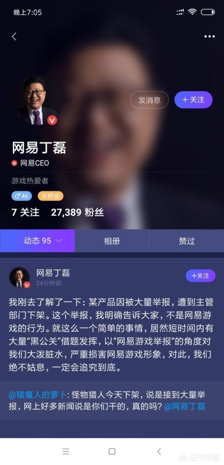 对于这个问题,网易CEO丁磊昨晚否认与网易游戏有关,他明确表示这不是网友游戏的行为。此外,他提到网易因此遭遇了大量“黑公关”借题发挥,以“网易游戏举报”的角度对网易大泼脏水,严重损害了网易游戏形象,对此网易绝不姑息,一定会追究到底。