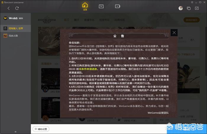 今天早上,腾讯发布公告:WeGame平台的《怪物猎人:世界》现已停止销售。这一消息的放出,让所有wegame猎人都失望满满,肝了几天的装备素材都要烟消云散了。
