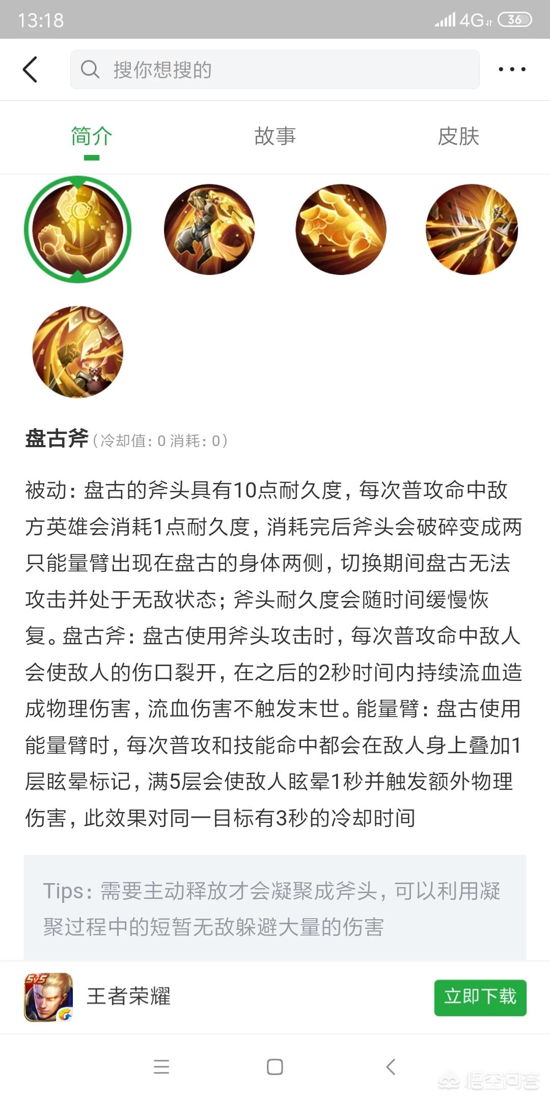 盘古被动:在持斧情况下普攻有掉血效果,10次普攻命中英雄会切换成能量臂,能量臂命中五次会眩晕敌方英雄。