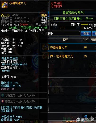 夜雨黑瞳是目前95版本的毕业武器,论伤害提升自然也是最强的,夜雨黑瞳武器属性技能攻击力+55%,最终伤害+32%。武器提升1.55*1.32=104.6%,比苍穹武器还要提升大概8%的提升,是目前版本各职业的最终武器。