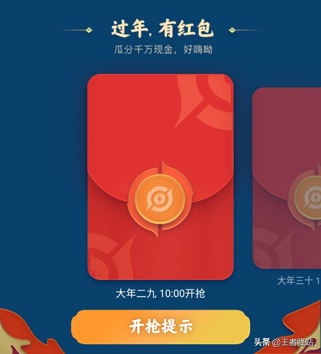 此外从明天年二十九到年三十会有三次抽红包的奖励的机会,分别是明日10点,年三十10点、年三十16点,大家千万不要错过了,奖励也是非常丰厚,最高可获得188元红包,当然也会有点券抵扣卡等奖励,关于抽奖的概率想必大家也很清楚,王者荣耀的抽奖一般都是极少数人才会得到好的东西,不过新年也是图个喜庆,不妨参与试试。