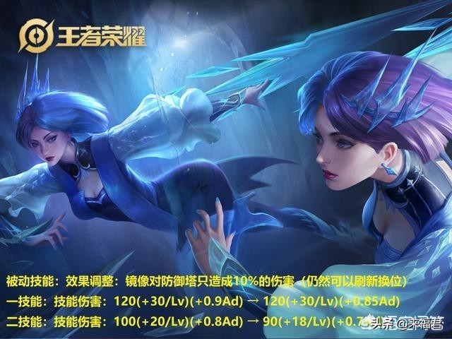 镜的调整一点都不意外,这个英雄在当前版本是绝对的T0级别,无论是巅峰赛还是职业赛场上都是如此。除了超高的爆发之外,镜的镜像磨塔能力也是很无解的,顺风的时候对面只能眼睁睁看着镜磨塔却没有任何办法。这次的调整将镜像对塔的伤害降低到了10%,基本上就是不能再磨塔了,一二技能的伤害也有所降低,整体强度会有一定下滑。