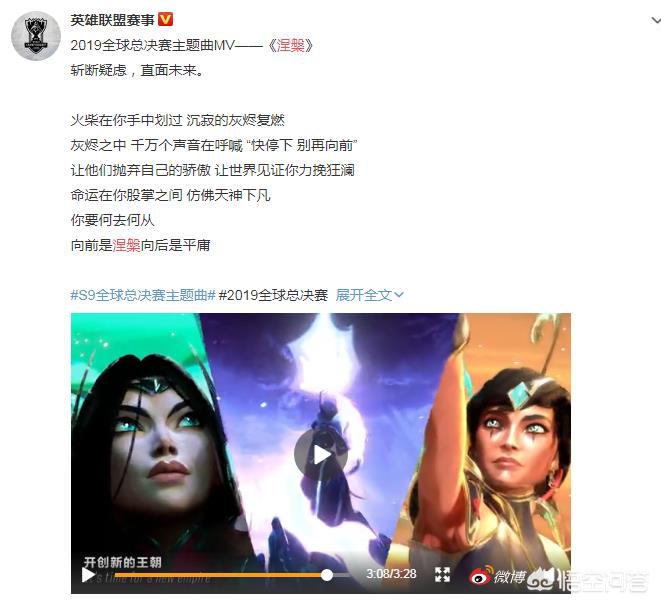 2019年10月9日凌晨,英雄联盟官方终于发布了S9全球总决赛的主题曲和MV《涅槃》。说实话,这只主题曲和MV可以在历届MV中排倒数了,和S8时期的《登峰造极境》相比,很难唱,传唱度也一般。