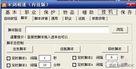 第四部:打开木剑相逢辅助,点击挂机功能,在脚本路径后面,点击浏览,将刚才保存的脚本上传上来,或者直接将脚本拖到这个界面