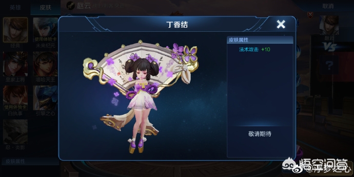 其实现在小乔的皮肤已经算是王者荣耀里比较多的了,限定皮肤,史诗皮肤,典藏皮肤,她全都有,现在又给她推出了一款六元的福利皮肤。基本上技能特效目前看来应该是紫色的特效。而且名字是丁香结,所以在技能上可能会有丁香的痕迹出现,应该就是开大招的时候会掉落的就是丁香。