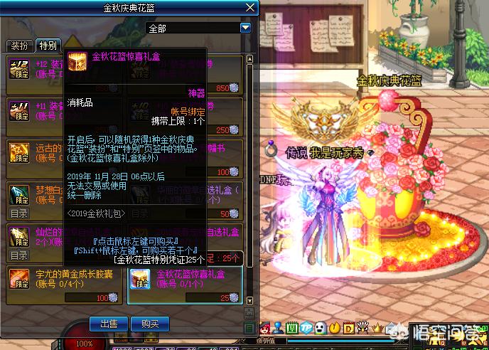 其次,在花篮的特别凭证兑换页面,每一个账号可以25个凭证兑换一个“金秋花篮惊喜礼盒”,账号只能兑换1个,而这个惊喜礼盒,可以随机开出花篮内的所有道具,也就是说,二觉装扮礼盒的主要产地就在这里。