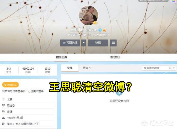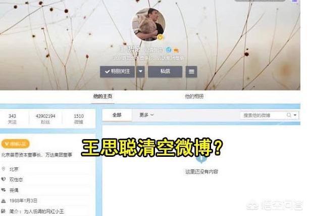 首先关于王思聪清空微博这个情况有必要做一个解释,王思聪的微博设置为半年可见,也就是说看不到半年前发的微博,而恰好在半年内他又没有发微博,就显得好像王思聪清空了微博一样: