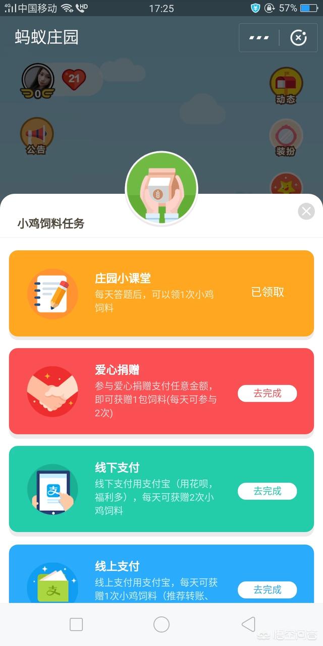 其中,获取爱心饲料有5种方式:庄园小课堂、爱心捐赠、线下支付、线上支付和邀请好友。