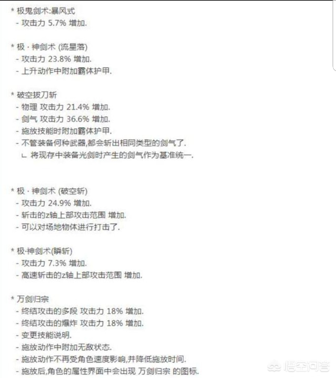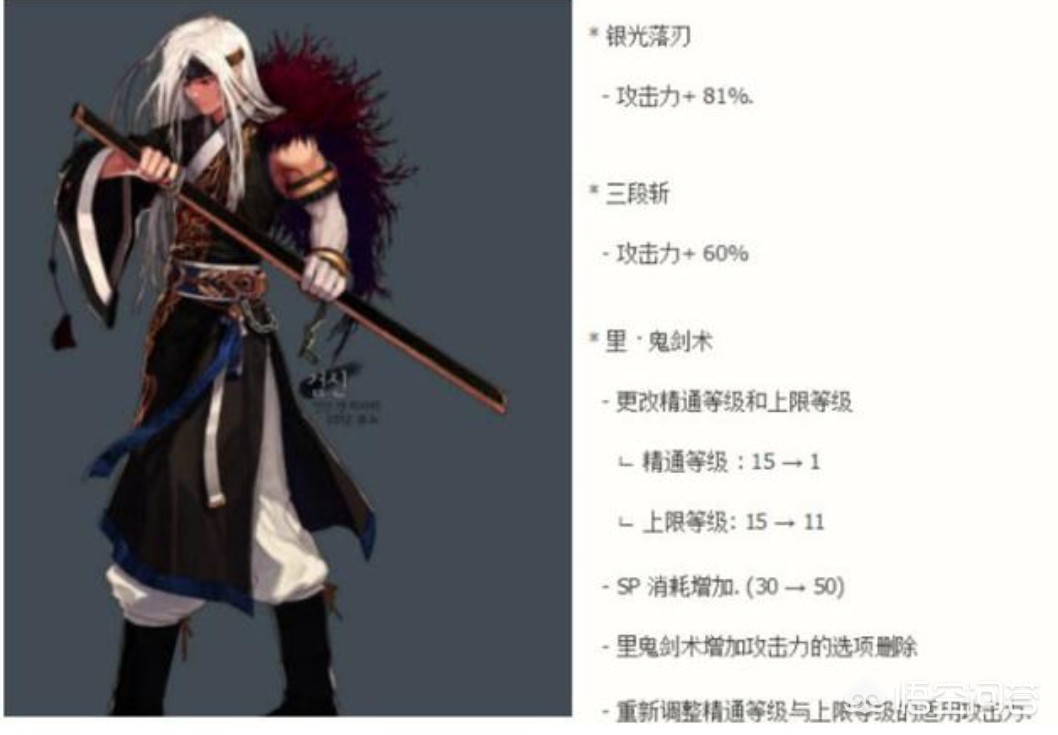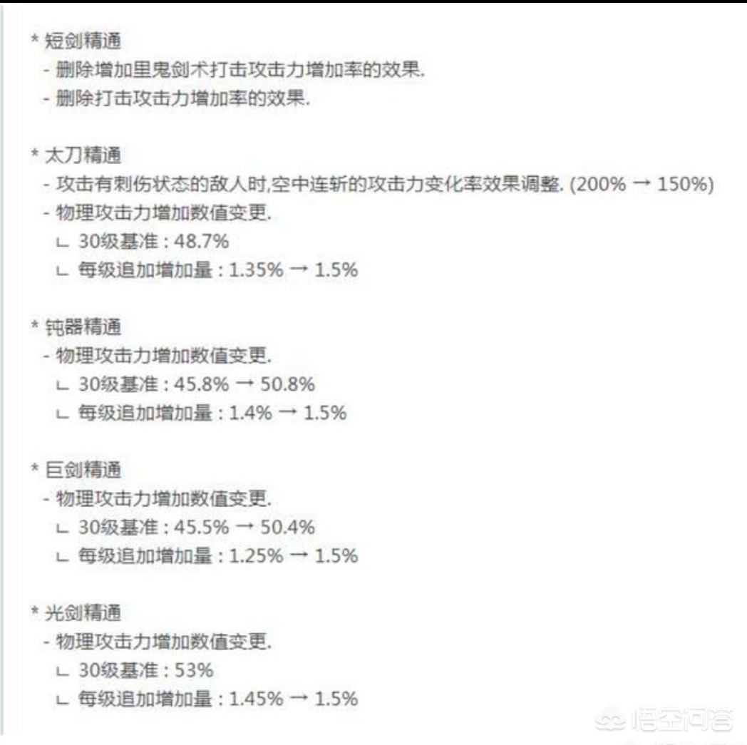 首先剑魂加强就是武器精通,对于加强之后,我感觉剑魂的面板应该会随之而增加的。然后就是关于李鬼剑术里鬼剑术从满级15降到了11。这个到底是加强了还是削弱了?还不好说,然后就是银光落刃和三段斩的攻击力增加,我个人感觉这两个技能对于剑魂并不怎么样。