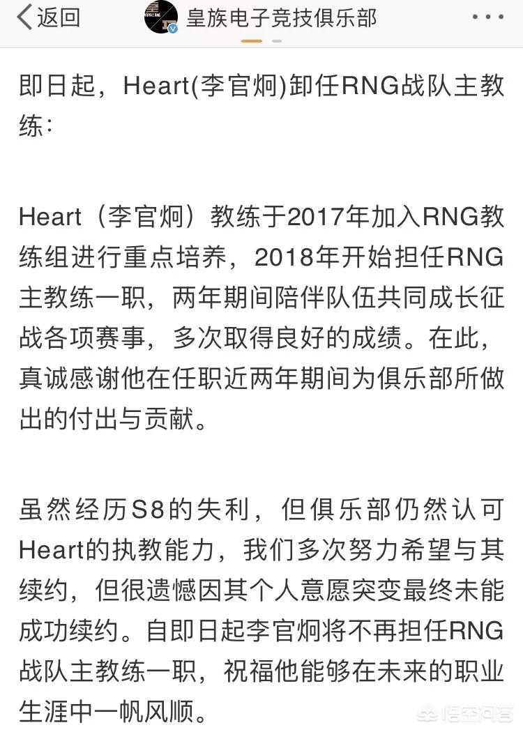 Heart教练今年一年的表现都非常的优秀,他的BP帮助这个队伍拿下了几乎全部的冠军,同时也让队内的气氛活跃了起来,但是随着世界赛输给了G2,让RNG受到了很多人的调侃,官方也是在一个月之后给出了纪录片,看完纪录片之后我就知道Heart教练要完了,所有的玩家都表示这次Heart背锅了。就在今天凌晨,皇族电子竞技俱乐部发出声明,Heart离职!