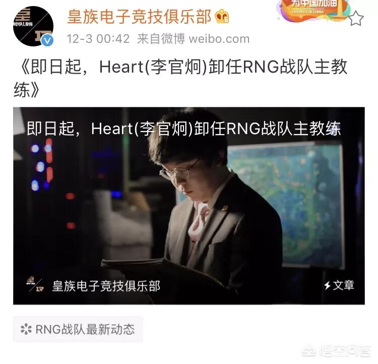 刚刚被评选为年度最佳总教练的RNG教头heart深夜发文,宣布卸任RNG总教练一职!这让所有喜欢RNG、喜欢心妈的粉丝无法相信!也有网友调侃“输了就是教练背锅”!