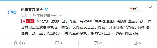 当时迅雷官网论坛就炸锅了,大量用户反馈,在各大媒体报道事情闹大后,迅雷在官方微博出了一个公告,称是加速模块显示故障,一周之内可修复(见下图)。可实际是过了一周并没什么改善,状况依旧。