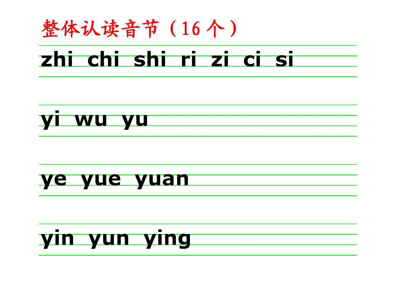 - 整体认读音节:记住16个,不需要拼读,直接读的:zhi chi shi ri zi ci si wu yi yu ye yue yuan