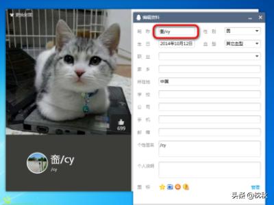5、对个人的昵称进行修改,可以加上文字和表情代码组合,输入代码的位置就是表情所在位置。