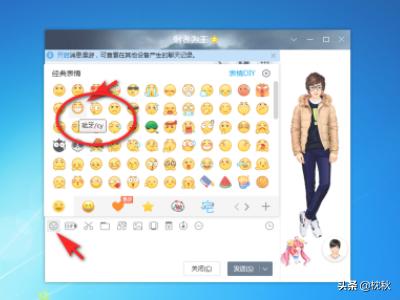2、我们点击左下方的表情,鼠标选中一个表情后,后面就会出现一个代码,比如这个咧嘴笑(呲牙)代码就是/cy。