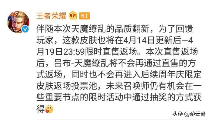 王者荣耀将于4月14日进行版本更新,随之而来的是吕布的限定皮肤-天魔缭乱返场,售价:1788点券。