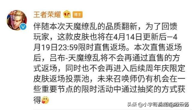 大家好,我是小宇哥游戏解说zeno,接下来我们讨论一下这个关于吕布这款限定天魔缭乱皮肤,根据王者荣耀所说,天魔缭乱这款皮肤将会在4月14号返厂,19号下架,将不会在直售了,今天也是最后一天了,以后会在抽奖宝箱里出现,这款皮肤已经可以说成荣耀典藏皮肤了,新皮肤可以以后经济充裕再买,但这款是限定皮肤,所以没有入手的小伙伴抓紧时间吧。