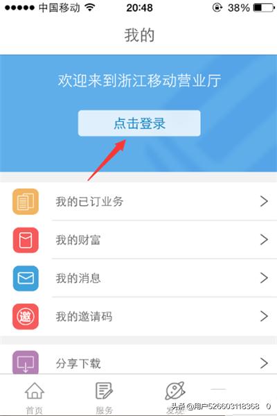 这时会弹出登录账号的对话框,在这里我们输入自己的移动手机号码,并正确输入服务密码后登录移动营业厅。