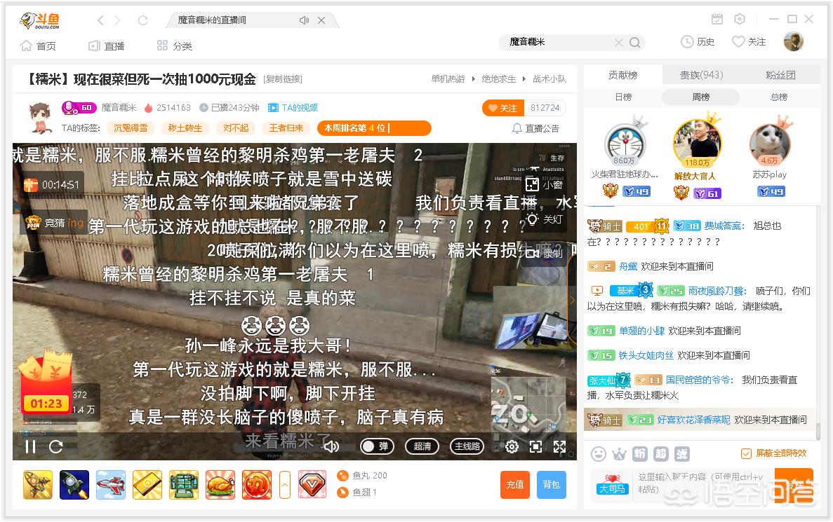 网友A:新的斗鱼吃鸡一哥诞生了,但是为何总觉得糯米直播间的弹幕好少啊,和当其他一哥的没法比。