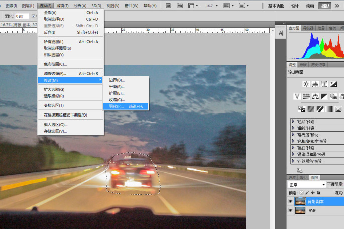 第二步:用多边形套索工具将车粗略框起,然后点击选择——修改——羽化