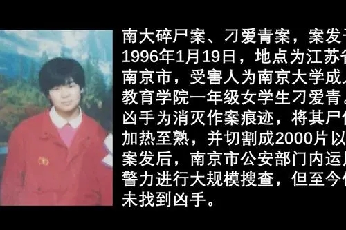 1996年1月19日,南京大学一年级女学生刁爱青失踪9天后遗体碎片被发现,凶手为消灭作案痕迹,将其尸体加热至熟,并切割成2000片以上,“南大碎尸案”因令人发指的分尸数量在当时轰动全国,距离“南大碎尸案”发生已经过去了25年,但该案件仍未侦破。