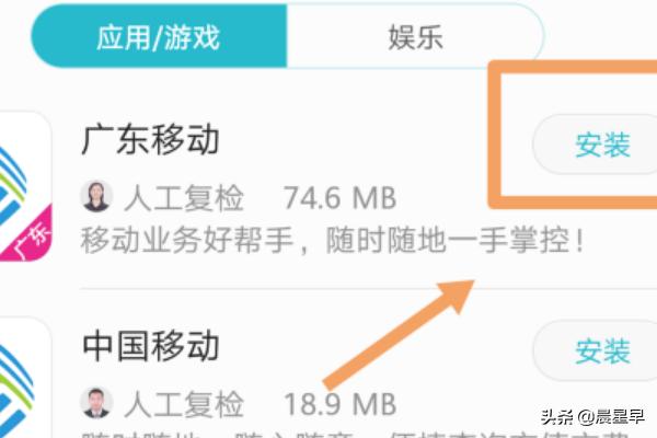 2、进入应用市场后,在上方的搜索框内,输入“广东移动”并点击搜索。在下方的搜索结果列表中,点击“广东移动”后的安装按钮。