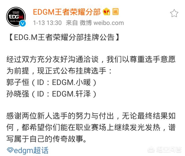 1月8日是新一届《王者荣耀》KPL转会期正式开启的日子。而EDGM也成了各大KPL俱乐部的表率,完全不拖泥带水的,一上来就直接官宣三则重磅消息,即三名核心成员无痕、猪哼、KOKO合同到期成为自由人并离开。不过EDGM的挂牌名单却迟迟没有出来,刚开始很多人以为EDGM这一次并没有选手选择挂牌。不过在挂牌期的最后一天即1月13日,EDGM还是官宣了本次转会期挂牌选手名单。这一次EDGM一共挂牌两名选手,不仅是轩泽要走,连985高材生、首发辅助小暖也想走!
