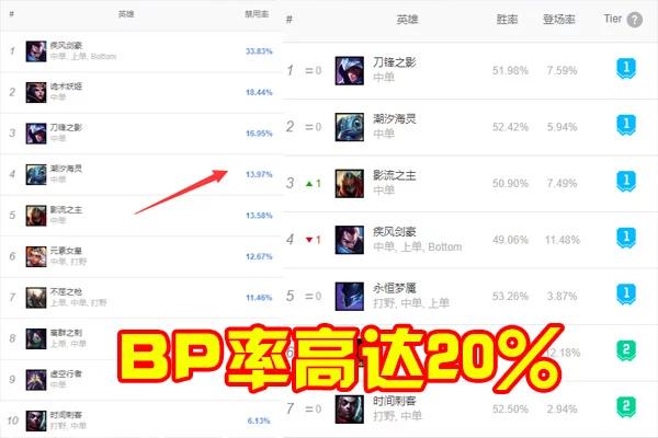 我相信任何一个中单玩家都应该被小鱼人制裁过,这个英雄起来之后,几乎可以用不讲道理来形容,无论你在哪里?他都可以一套技能秒杀,就算是在泉水中,也有可能被击杀。目前小鱼人已经进军到了t1级别,仅次于男刀,BP率接近20%,胜率更是高达52.4%,几乎很少有英雄能够做到这样的成绩。不得不承认,作为一个近战刺客法师,他在六级之后的爆发,几乎很少有中单能够承受的住。