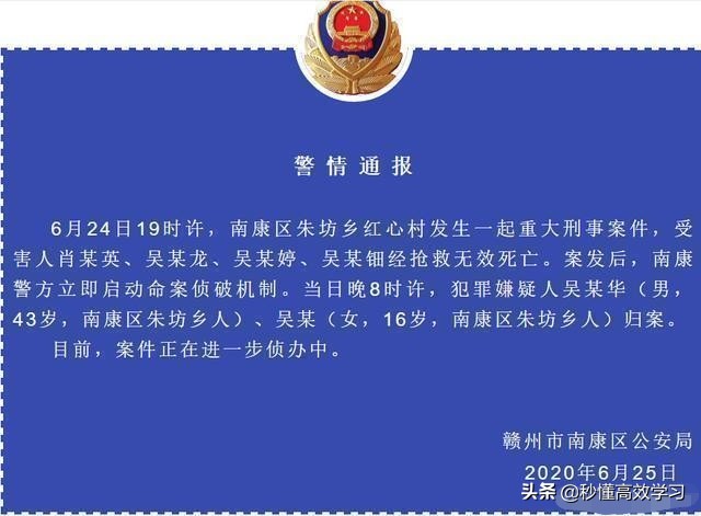 事件回顾:6月24日晚7时许,江西省赣州市发生了一起重大杀人惨案:4人死亡(2人当场死亡,2人送医抢救后不治而亡),4名死者和杀人嫌疑犯均系该市南康区朱坊乡红心村村民。目前,2名杀人嫌疑犯已被警方逮捕。令人惊叹的是,杀人嫌疑犯之一的吴某,竟是一个年仅16岁的女生。
