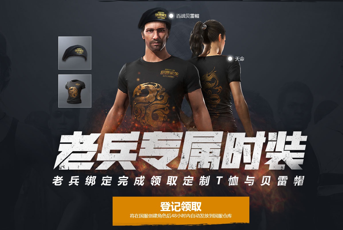 《绝地求生》为了吸引国际服老玩家回归,除了免费,还为老玩家准备了专属时装“百战贝雷帽”和“天命T恤”,看起来还蛮不错的!网页中也透露时装将发放到国服仓库,所以可以证明国服饰品与steam是不互通的。