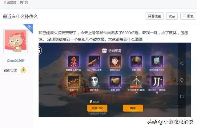 一石激起千层浪,很多公测时的老玩家纷纷回来看看自己的荒野账号上有没有补偿点券,小编也回荒野看了下自己的账号,发现一分钱没花过的自己也补偿了2000多点券,小编想都没想直接全部抽特训军需了,虽然没有出金色武器皮肤,但好歹也给我出了辆跑车,没想到我人生中第一辆跑车竟然是不要钱免费抽到的…哭唧唧。