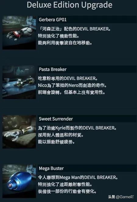 豪华版(Deluxe Edition):内容包含游戏与人物服装、四款特典义手、替换用战斗曲、评价播报、红色机车、真人影片。