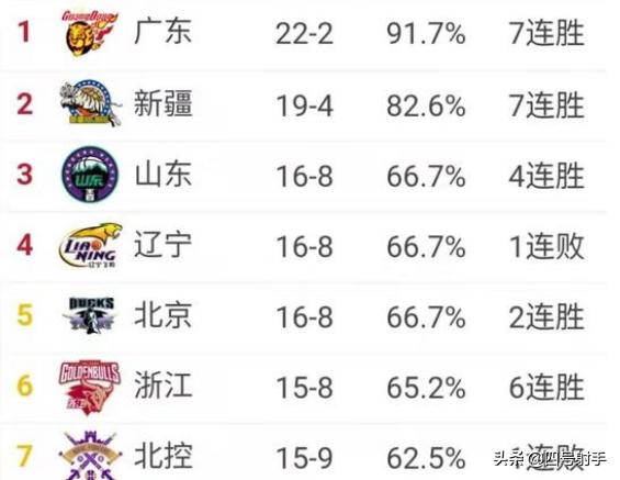 1-8名:广东、新疆、山东、辽宁、北京、浙江、北控、山西;