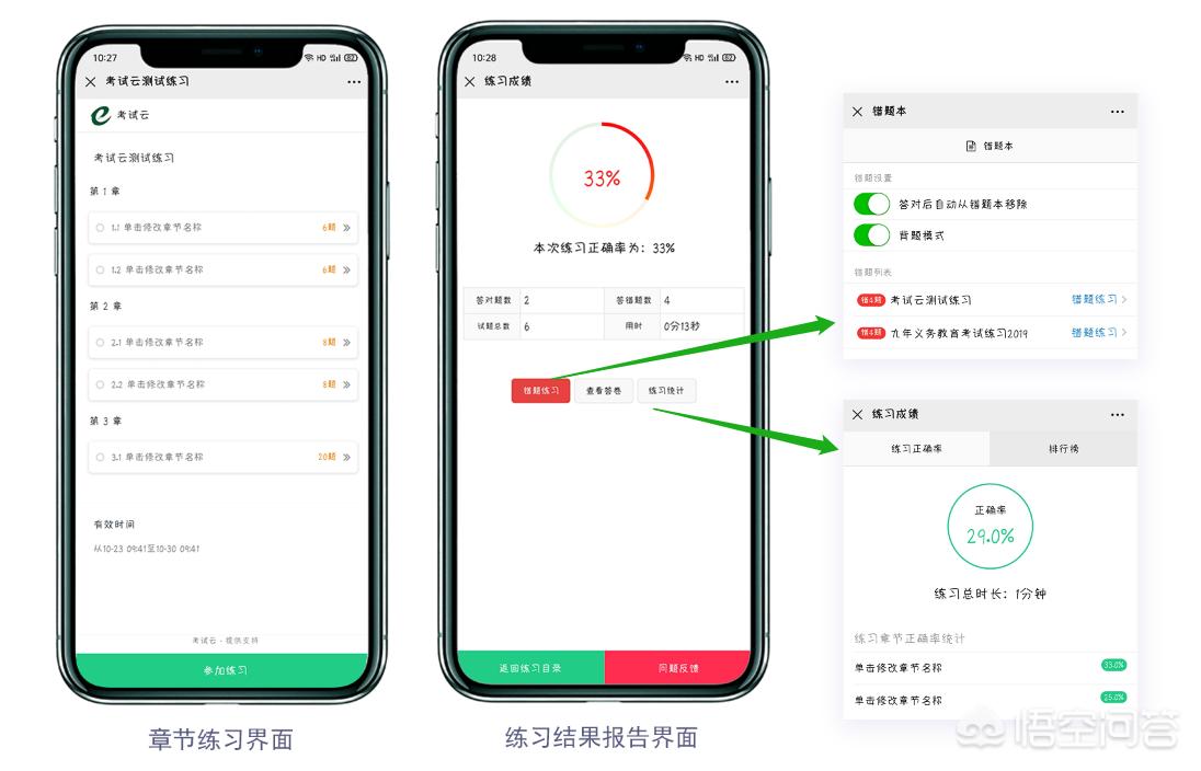 老师可以上传试题到网站后台,用微信发给学生,可以看到学生成绩,单个题的答案。学生可以做答,练习,也可以查看试题解析。