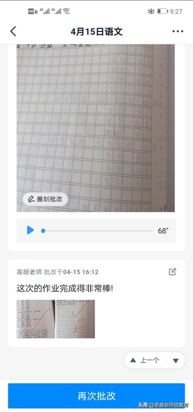 比如在钉钉在线作业中,除了直接全部批改作业外,还可以用图片音频视频动画表情等多种形式进行批改。完成比较好的作业,可以评为优秀作业,向全班推荐。当然,当学生作业内容不对或者错误太多的时候,教师可以直接把作业打回,让学生重新提交。