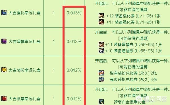 虽然从官方公布的16种幸运礼盒的概率来看,开出4种大吉礼盒的概率不是0.013%就是0.012%,加起来也就是0.05%的概率。但是我当时看到礼包内容和概率的第一时间还是做起了自己开出大吉礼盒的美梦,心想玩DNF黑了这么多年了应该能欧一次了吧?开个大吉礼盒卖个几千万、上亿金币岂不美滋滋?