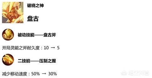 这次前期能力是削弱的,以前我打野对面东皇来反,我怒砍10斧头将东皇流血砍死,现在开局5耐久就打不过东皇了。而且20秒回复一耐久,盘古前期达到满耐久需要100秒也就是在1分40秒的时候可以满耐久,但是我得盘古习惯一分钟就去搞事,所以这方面就弱化很多。