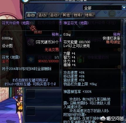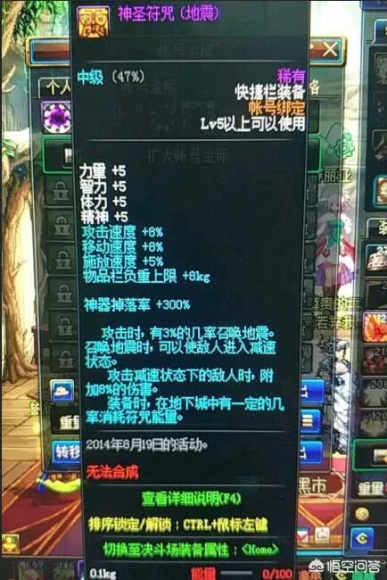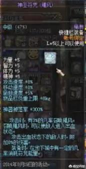 原来这件装备的名字为神圣的符咒,它的种类也很多,比如地震、冰柱、飓风等,随着种类的不同,它的攻击特效也会随之而改变。但是这些符咒的大致属性都是一样的,四维+5,双速+8%,释放速度+5%,物品栏负重上线+8kg,神器掉落率+300%,但是在地下城中会消耗自身的能量。这个装备曾经是任务给的,谁都能得到。可是当时很多玩家认为它没用,不是分解了,就是给扔了,现在想起来后悔万分。